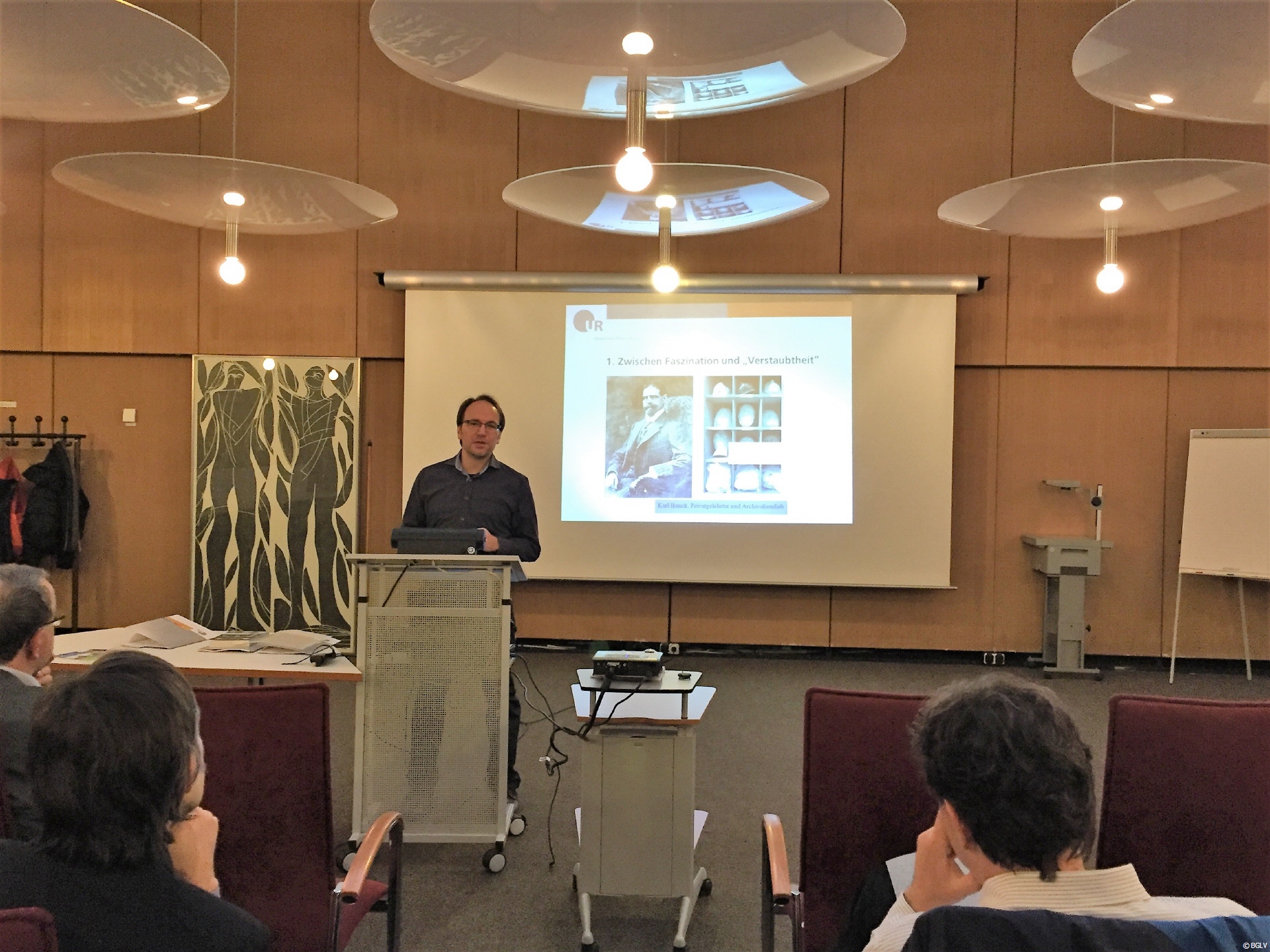 Archivoberrat Dr. Till Strobel, stellvertretender Leiter des Staatsarchivs Amberg, widmete sich in seiner Präsentation unterschiedlichen „Möglichkeiten für Recherche, Forschung und entdeckendem Unterricht im Staatsarchiv Amberg am Beispiel von Spruchkammerakten (zum Themenbereich ‚Entnazifizierung in der Oberpfalz‘)“. Zunächst ging er auf die staatlichen Archive Bayerns und ihre Aufgaben ein und stellte insbesondere sein Haus vor (F http://www.gda.bayern.de/archive/amberg/). Im Anschluss widmete er sich den auf Schulen zugeschnittenen Betreuungsangeboten und zeigte, welche Möglichkeiten es gibt, die für schulische Forschungen vorzüglich geeigneten Spruchkammerakten in den Geschichtsunterricht innerhalb des Themenkomplexes Entnazifizierung zu integrieren. Diese Bestände des Staatsarchivs Amberg wurden von StD Emmer mit seinem W-Seminar Geschichte am Gymnasium Parsberg kürzlich mit großem Erfolg genutzt.