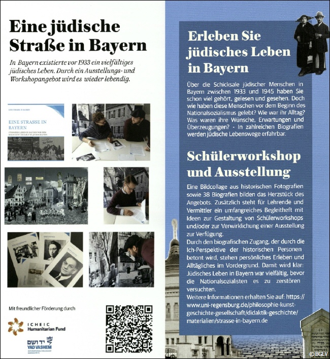 Nach dem Vorbild von „Eine Straße in Polen“ der zentralen israelischen Gedenkstätte Yad Vashem besteht das Projekt aus einer fiktiven bayerischen Straße, die als Collage aus historischen Fotografien konstruiert ist. In ihr könnten jüdische Bayern so oder so ähnlich gelebt haben. Dazu recherchierten und dokumentierten die Studierenden auf der Basis von Quellen und Lebenserinnerungen 38 Biografien, die exemplarisch für die damalige jüdische Bevölkerung in allen bayerischen Landesteilen stehen.